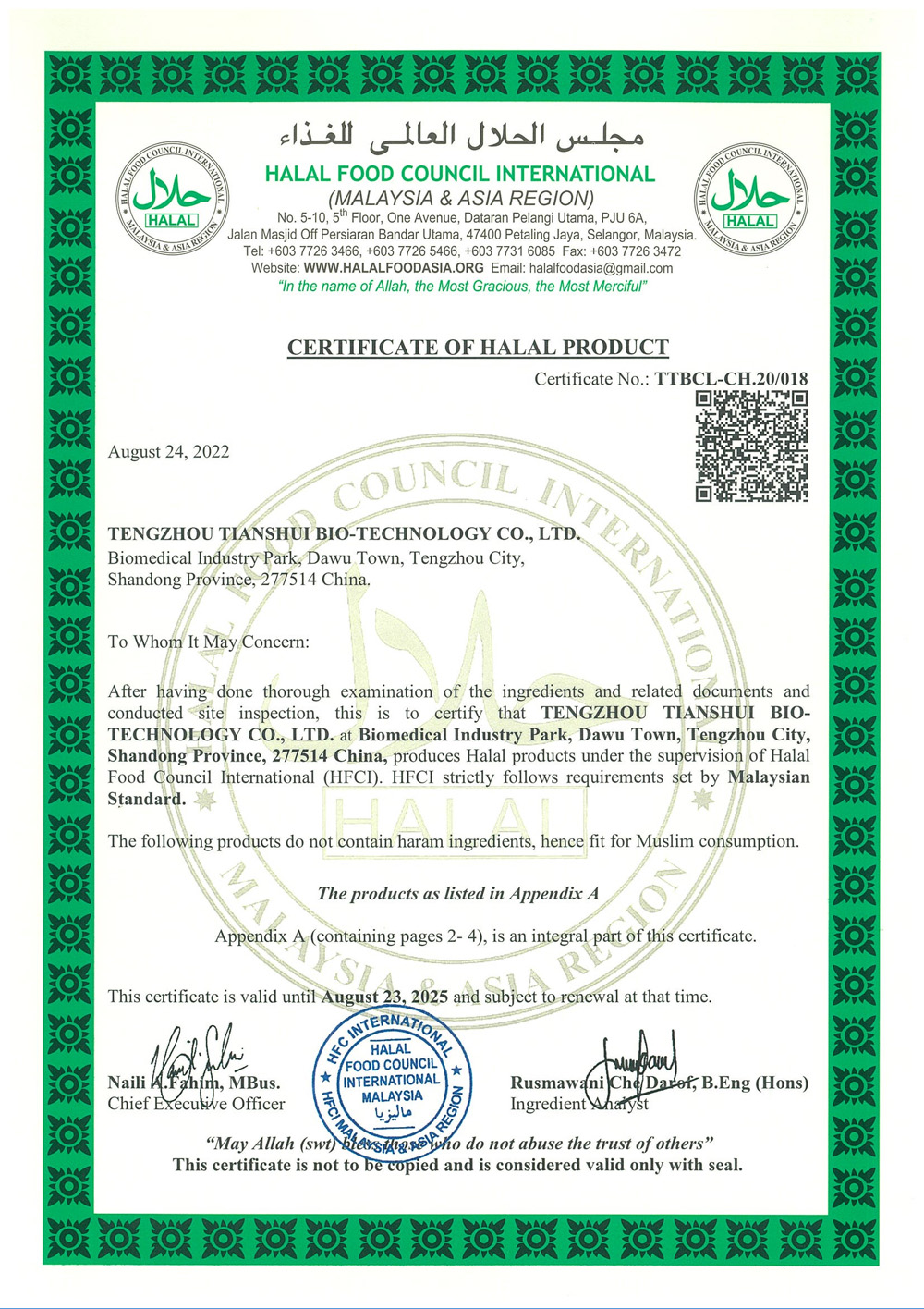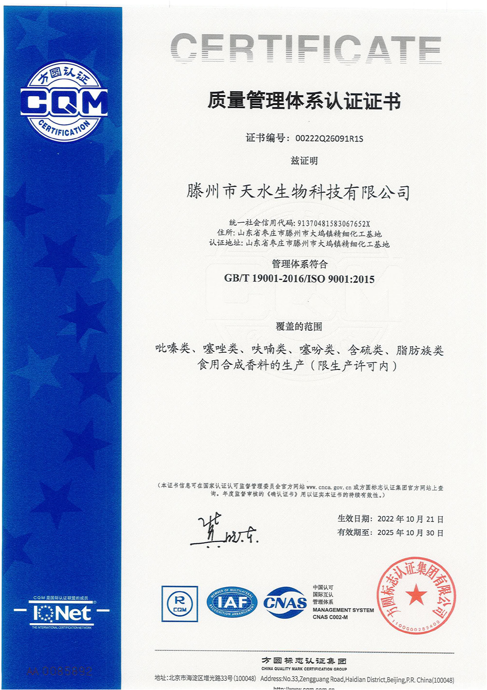 滕州市天水生物科技有限公司成立于2011年9月,是目前國內(nèi)雜環(huán)類合成食品香料、日化香料和醫(yī)藥中間體生產(chǎn)經(jīng)營的綜合性企業(yè)。坐落于山東省滕州市生物醫(yī)藥產(chǎn)業(yè)基地,總投資5000余萬元,占地面積約30000平方米,員工百余人。公司先后被評為高新技術企業(yè)、專精特新中小企業(yè)、科技型中小企業(yè),建有市級重點實驗室1處,并先后獲得ISO9001質(zhì)量體系認證、ISO22000食品安全體系認證、kosher認證和Halal認證。是香精香料及食品配料協(xié)會會員單位及滕州市中小企業(yè)協(xié)會理事單位。